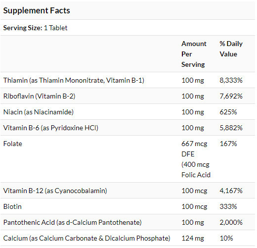 - багатий комплекс вітамінів групи В. Кожна таблетка містить розширений спектр інгредієнтів, зокрема B1 (тіамін), B2 (рибофлавін), B3 (ніацин), B6 (піридоксин), B12 (ціанокобаламін) та ін. Ці вітаміни відіграють важливу роль у підтримці енергетичного метаболізму, функціонуванні нервової системи, сприянні здоров’ю шкіри та виробленні червоних кров’яних клітин;