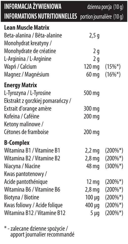 Склад. Оскільки це комплекс, то закономірно, що у його складі присутні кілька активних компонентів, а саме: оксид азоту, бета-аланін, амінокислота тирозин, креатин (моногідрат) і B-Complex (вітаміни В1, В2, В3, В5, В6, В7, В9 та В12). Крім того, є такі інгредієнти: кальцій, магній, екстракт гіркого апельсина, кофеїн, кетони малини.