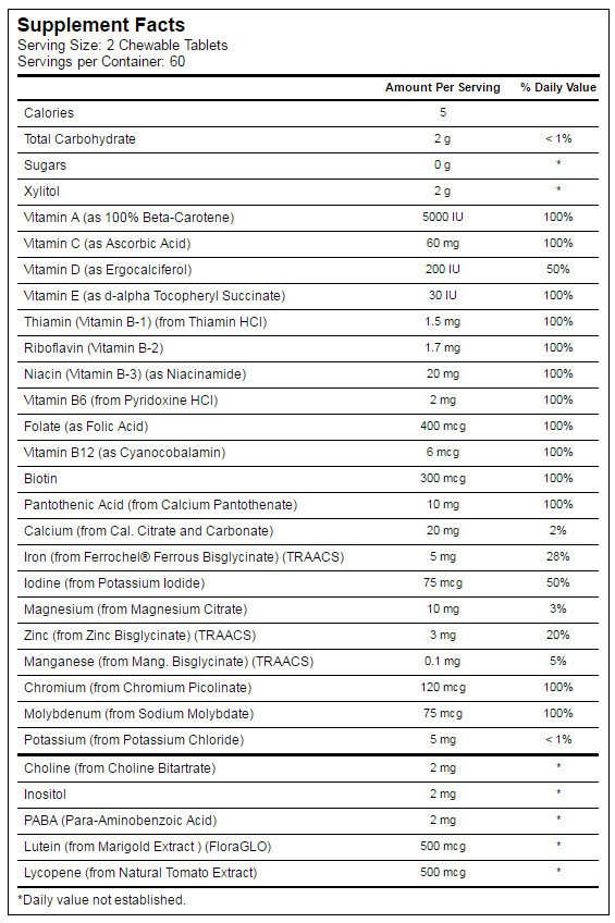 Склад: ксиліт, вітаміни А і С, ергокальциферол, d-альфа-токоферолу сукцинат, тіамін, рибофлавін, нікотинова та фолієва кислоти, піридоксин, ціанокобаламін, біотин, кальцію пантотенат і карбонат, залізо, молібден, калій, холін, інозитол, Пюїнте, лікопен, лікопен целюлоза, порошок кокосової олії, стеаринова кислота, порошок буряків, ксантанова камедь, натуральні ароматизатори, малинова кислота, діоксид кремнію, стеарат магнію, органічний стевіолглікозиди) і стевія екстракт листя Ребаудіозид А.